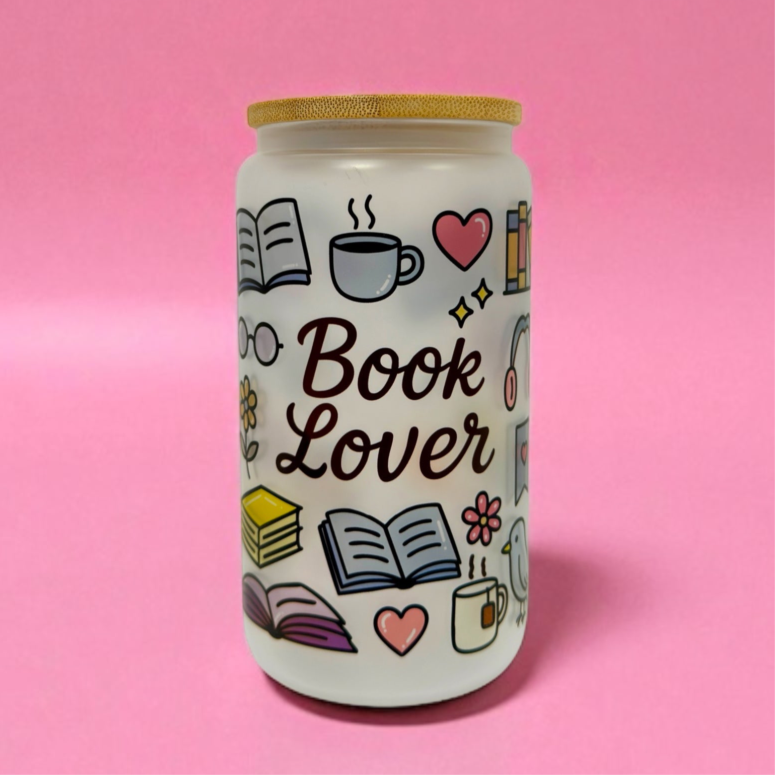 Perfect for cozy bookworms and coffee lovers alike. This 16oz frosted glass cup features a bamboo lid and is beautifully wrapped with charming illustrations of books, hearts, flowers, mugs, headphones, and more. A dreamy choice for adding a touch of literary magic to your daily routine.