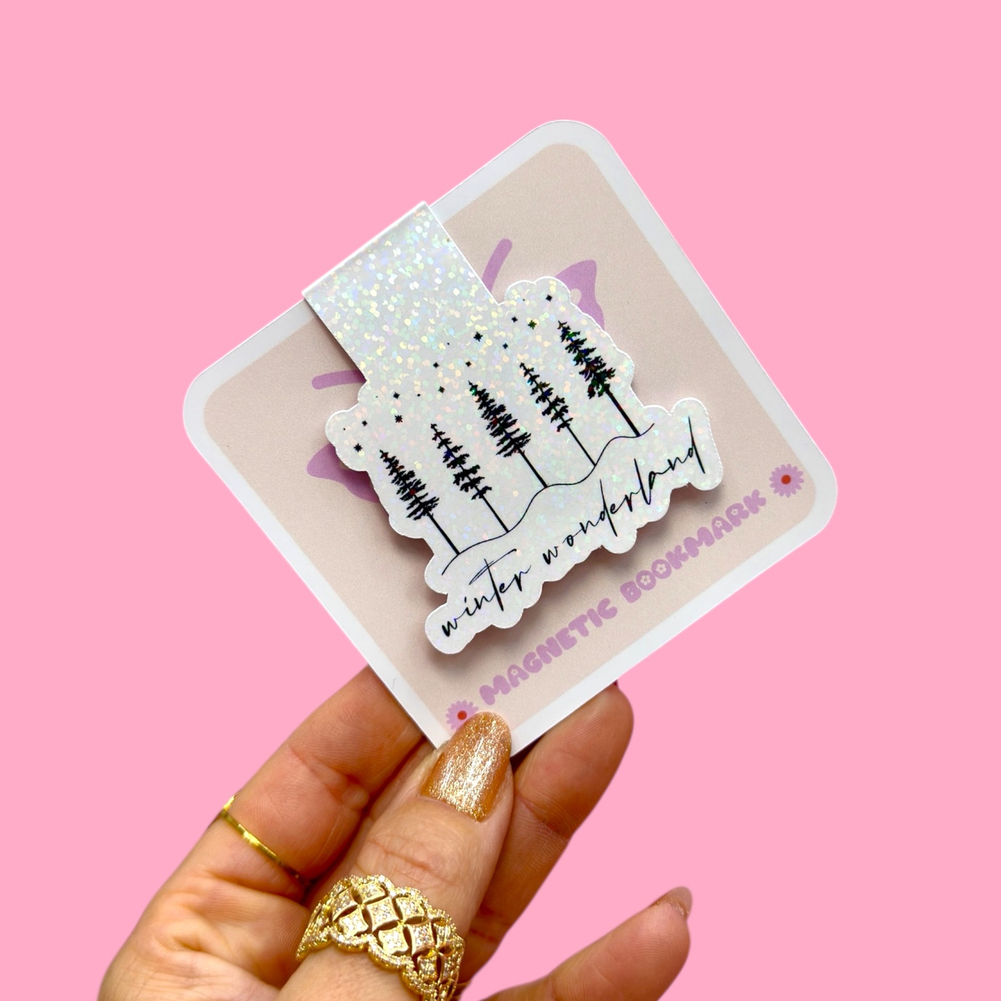 This glittery magnetic bookmark features a snowy pine forest and the phrase “Winter Wonderland”, perfect for dreamy readers and seasonal book lovers.