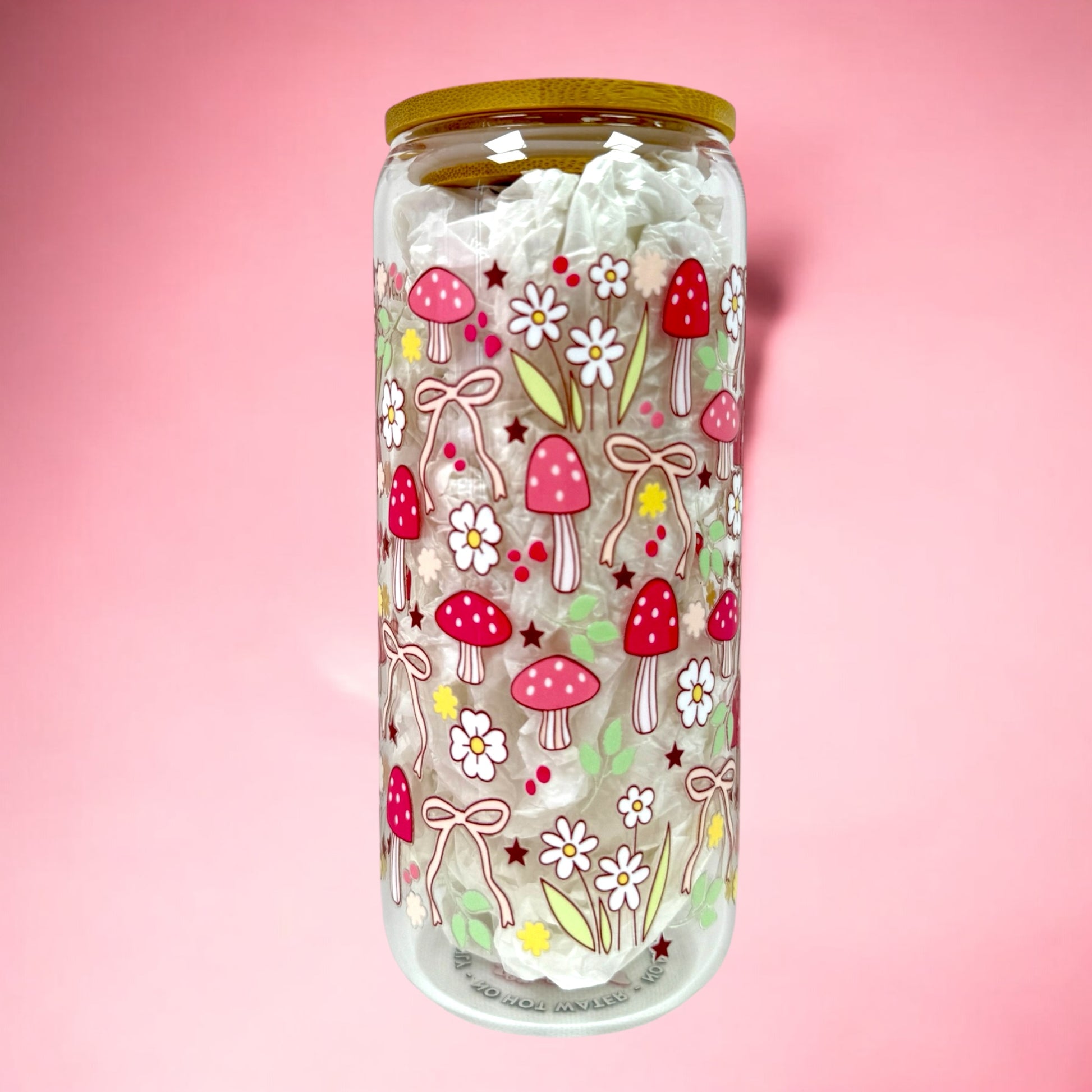 Add a touch of fairy-tale charm to your drinkware with our Forest Whimsy Glass Cup! Featuring an enchanting mix of red toadstool mushrooms, delicate wildflowers, pastel bows, and tiny stars, this 20oz glass is perfect for iced coffees, matcha, or your favorite cold drinks. 💖✨