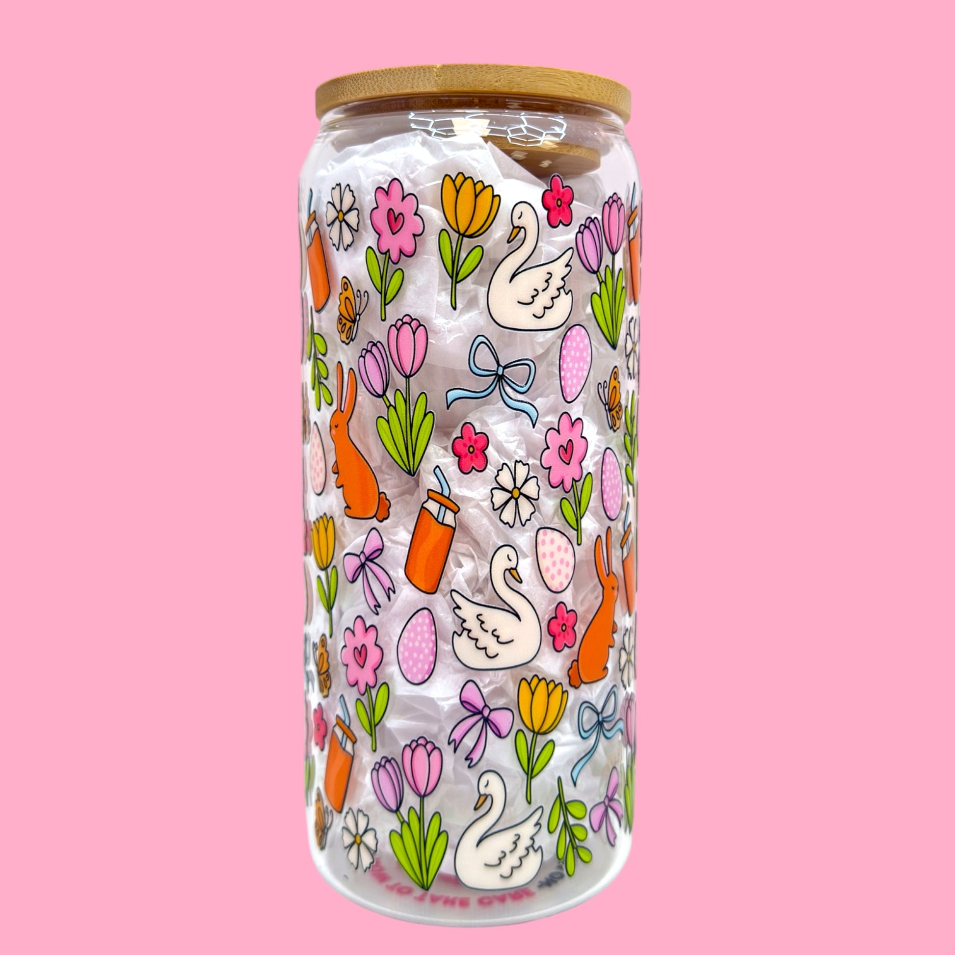 Say hello to the sweetest spring vibes with our 20oz Spring Garden Glass Cup 🌷💗 Covered in playful bunnies, swans, florals, bows and pastel Easter eggs, this design is fun, colorful and full of happy energy 🐰🦢✨