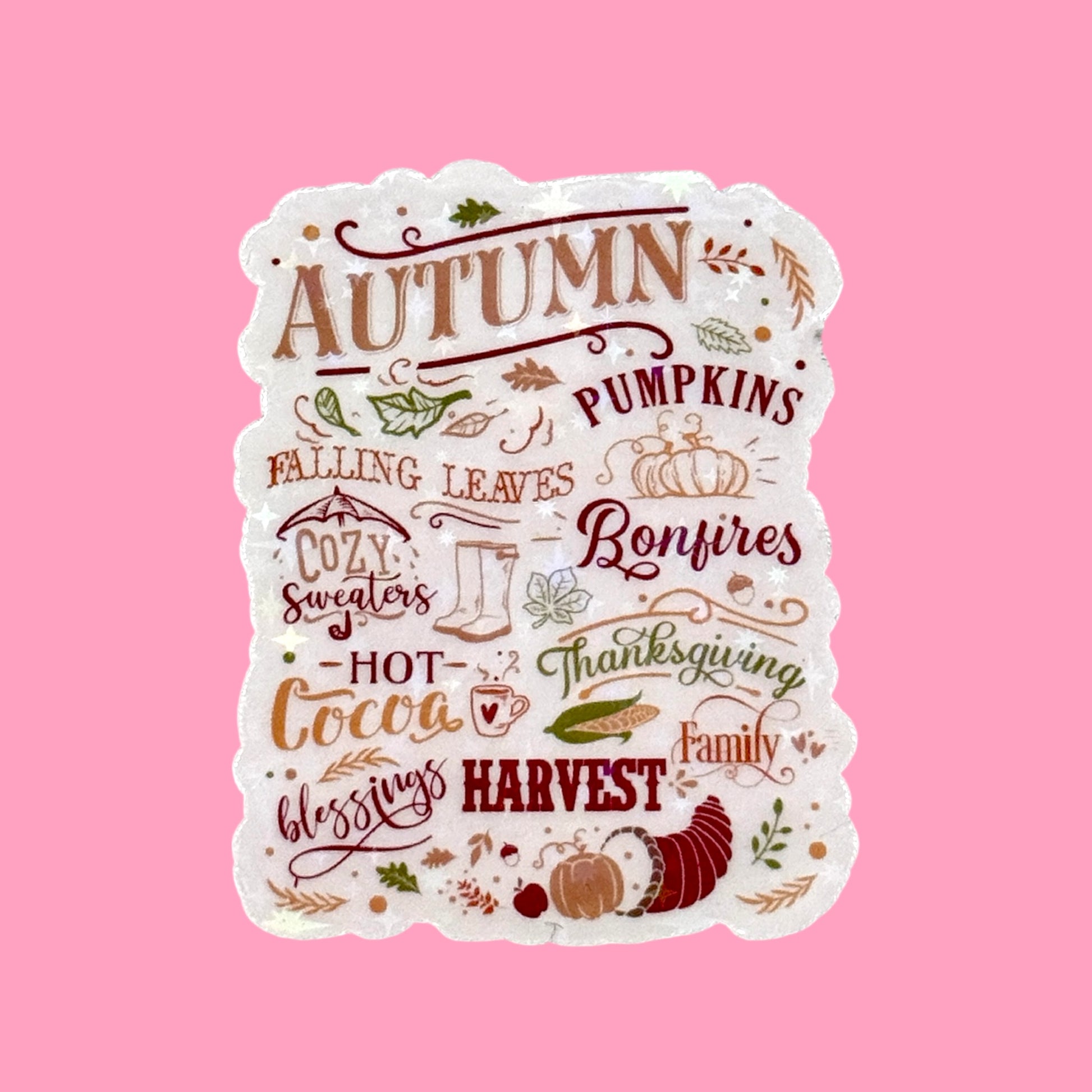 Celebrate all the best parts of fall with this holographic Autumn Vibes sticker. Featuring cozy words and illustrations like pumpkins, falling leaves, hot cocoa, bonfires, and Thanksgiving, it’s the perfect reminder of everything we love about the season. The holographic sparkle adds a magical touch that shines in the light, making it ideal for decorating your laptop, journal, water bottle, or planner. 🍂☕🧣🎃