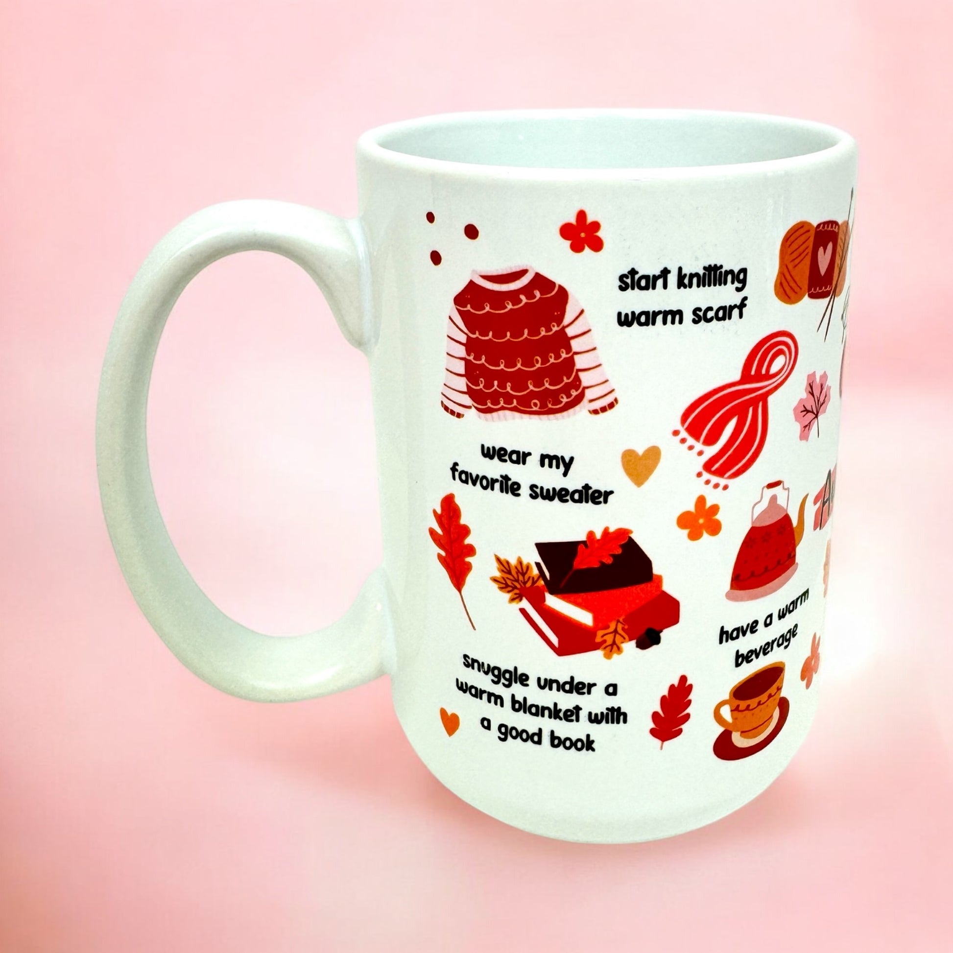 Wrap yourself in the warmth of fall with this oversized 15oz ceramic mug. Featuring cozy illustrations of books, sweaters, candles, and autumn leaves, it’s perfect for sipping your favorite seasonal drinks. Big enough for extra coffee or hot cocoa, this mug is a must-have for autumn lovers. 🧡✨