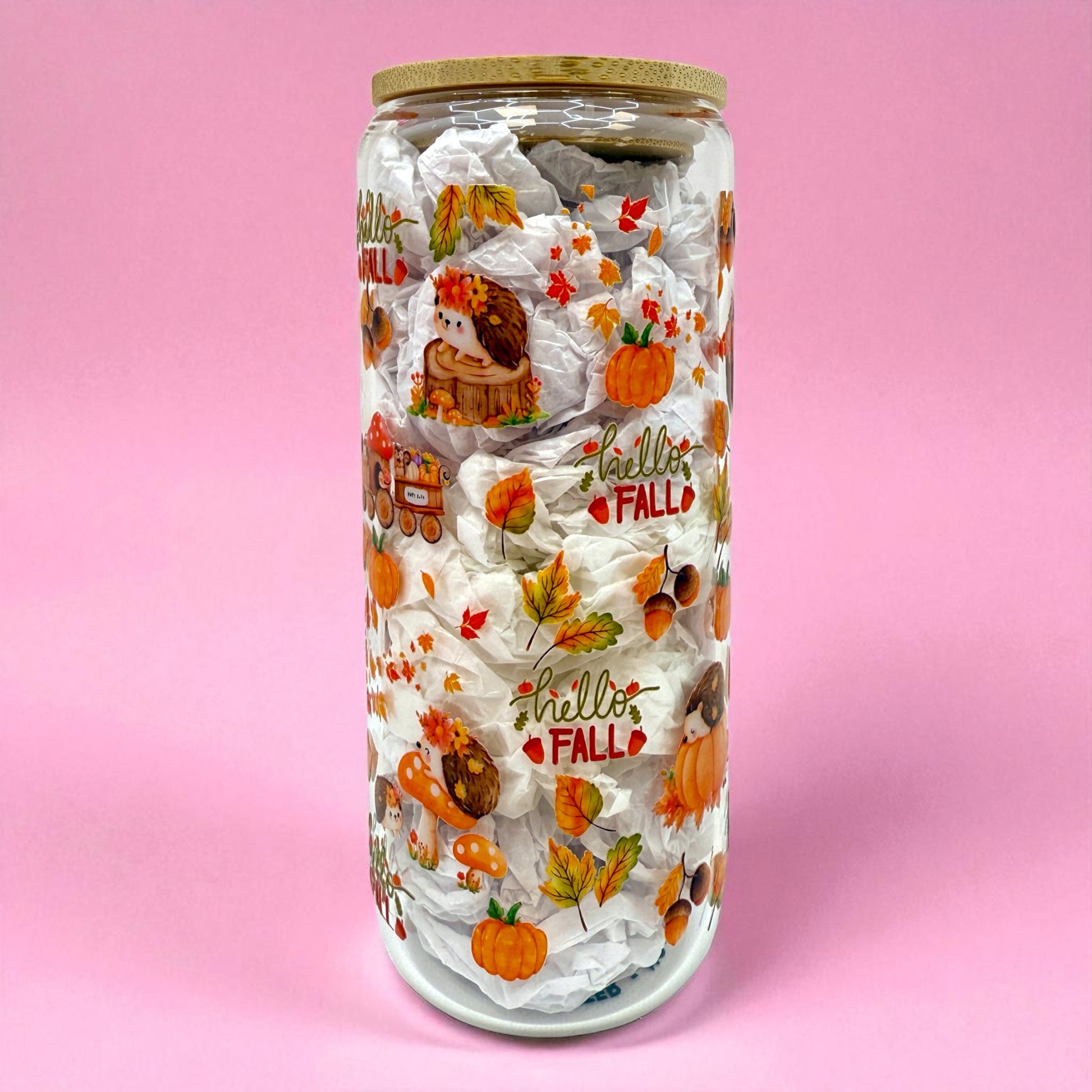 Bring charm to your fall drinks! This 20oz glass cup showcases a playful hedgehog surrounded by pumpkins, acorns, leaves, and a “Hello Fall” message. Ideal for sipping pumpkin spice lattes, iced coffees, or any cozy favorite. 🦔☕🍂
