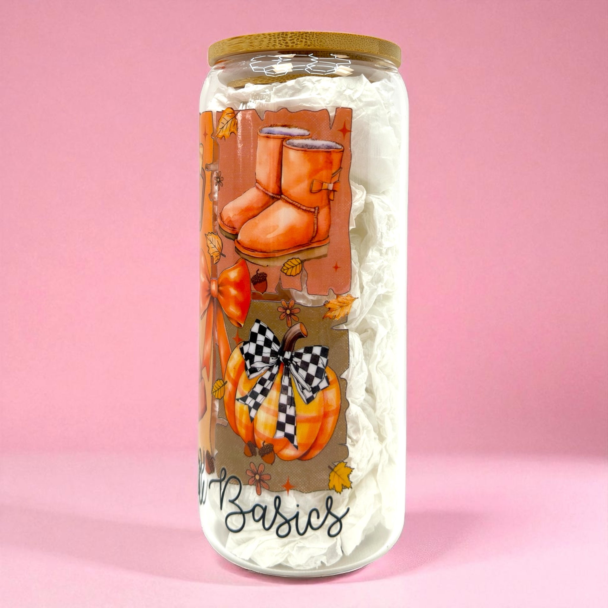 Cozy up with this Fall Basics 20oz glass can, perfect for your pumpkin spice latte, iced coffee, or autumn tea! 🍂✨ Featuring cute seasonal designs like pumpkins, bows, boots, and a cozy beanie, this frosted glass tumbler will be your go-to accessory all season long. 🧡 Comes with a bamboo lid and reusable straw, making it stylish, eco-friendly, and practical.