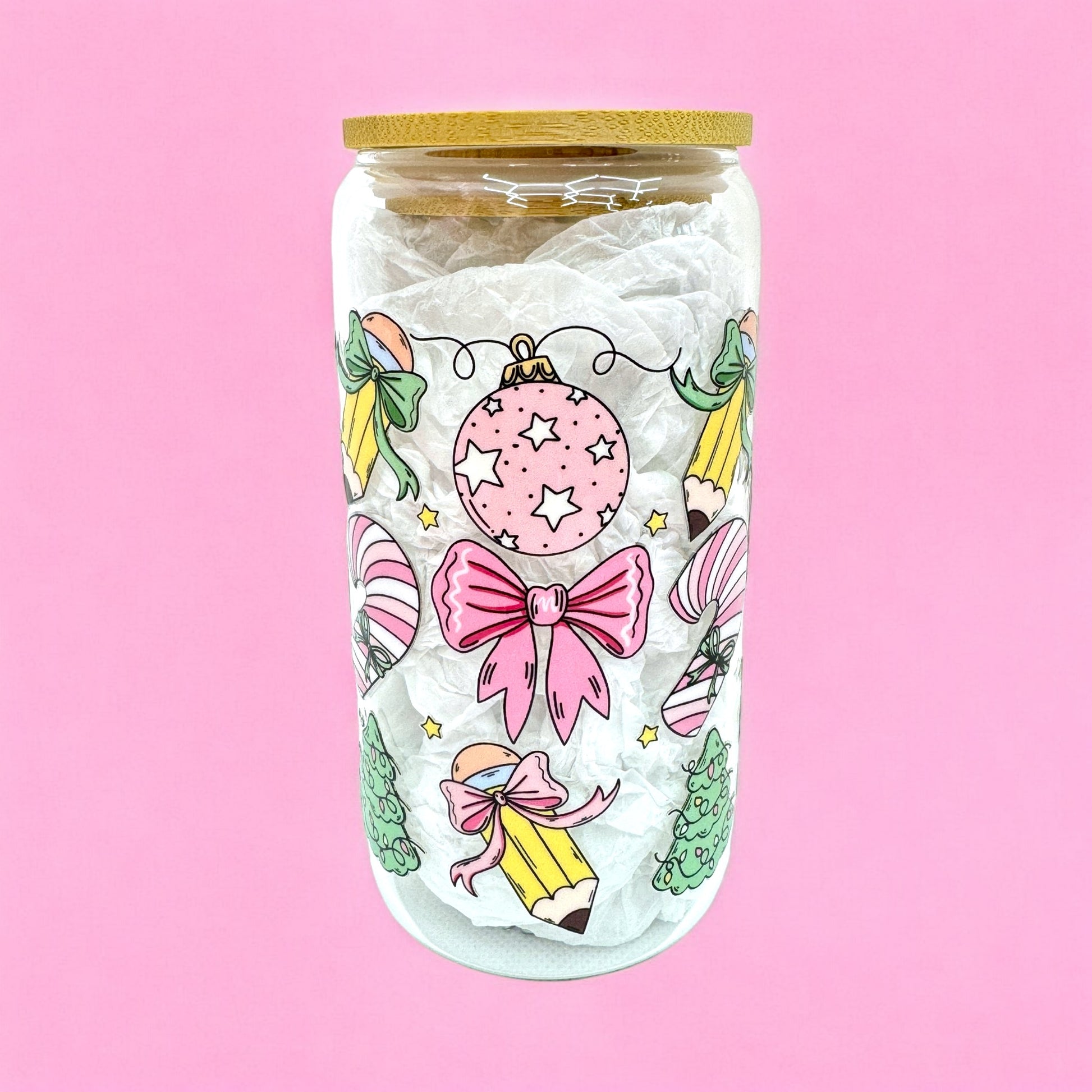 Add a sprinkle of sweetness to your festive drinks with this adorable 16oz clear glass cup, featuring pastel Christmas trees, candy canes, gingerbread men, and pink bows. The perfect mix of cozy and cute, it brings festive charm to every sip. 💕