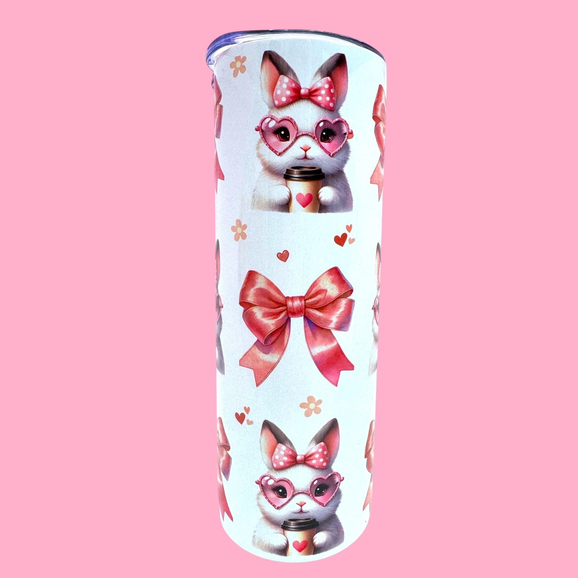 Fall in love with every sip 💕 This adorable 20oz tumbler features the sweetest bunny wearing heart-shaped glasses, a pink bow, and holding a little coffee cup, surrounded by soft bows and tiny hearts 🎀✨