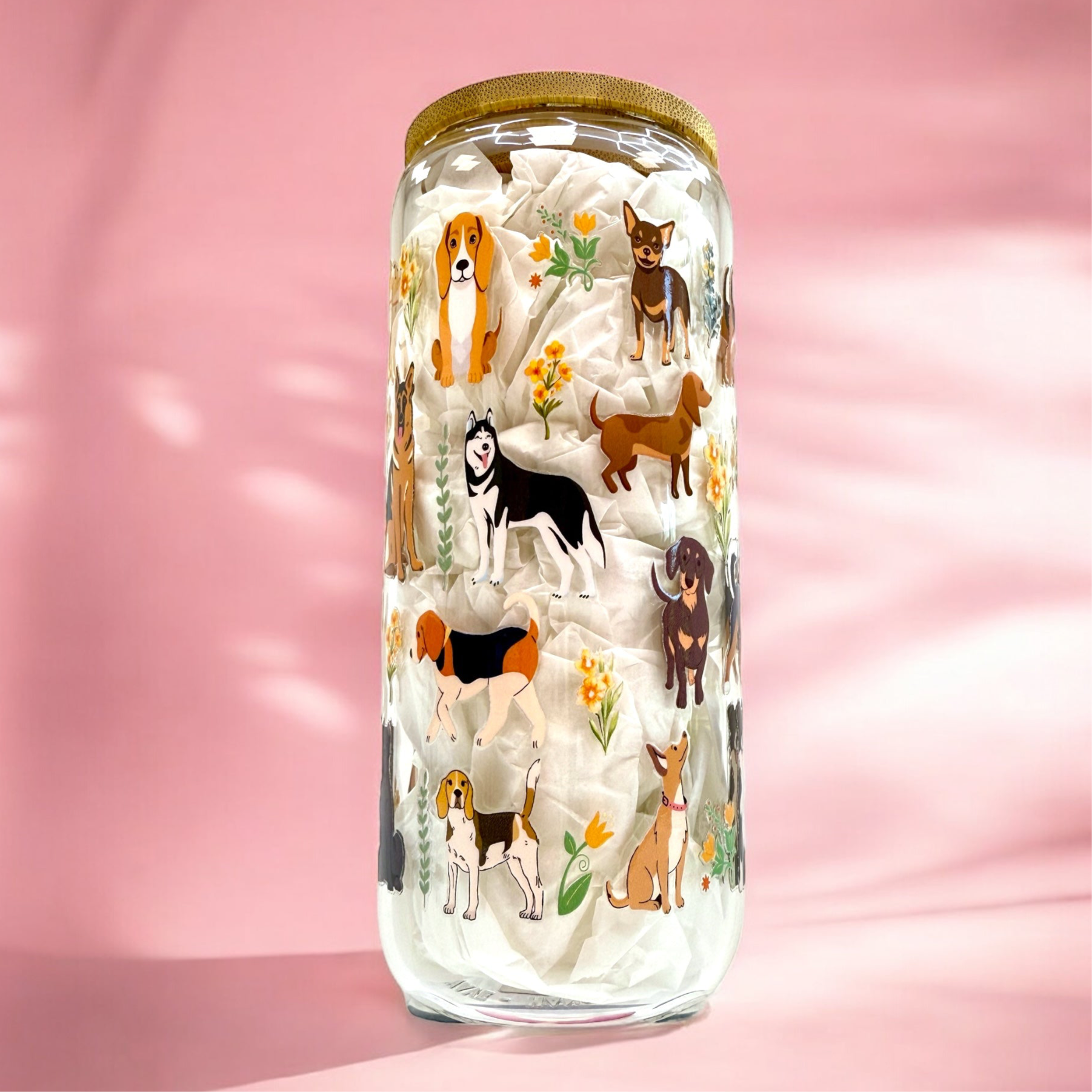 Sip in style with our “Puppy Love” 20oz glass cup – the paw-fect choice for every dog lover! 🐕💕 Featuring adorable cartoon dog breeds surrounded by flowers 🌼 and greenery 🌿, this cup brings joy with every sip. Whether it’s iced coffee, juice, or water, you’ll smile every time you reach for it!
