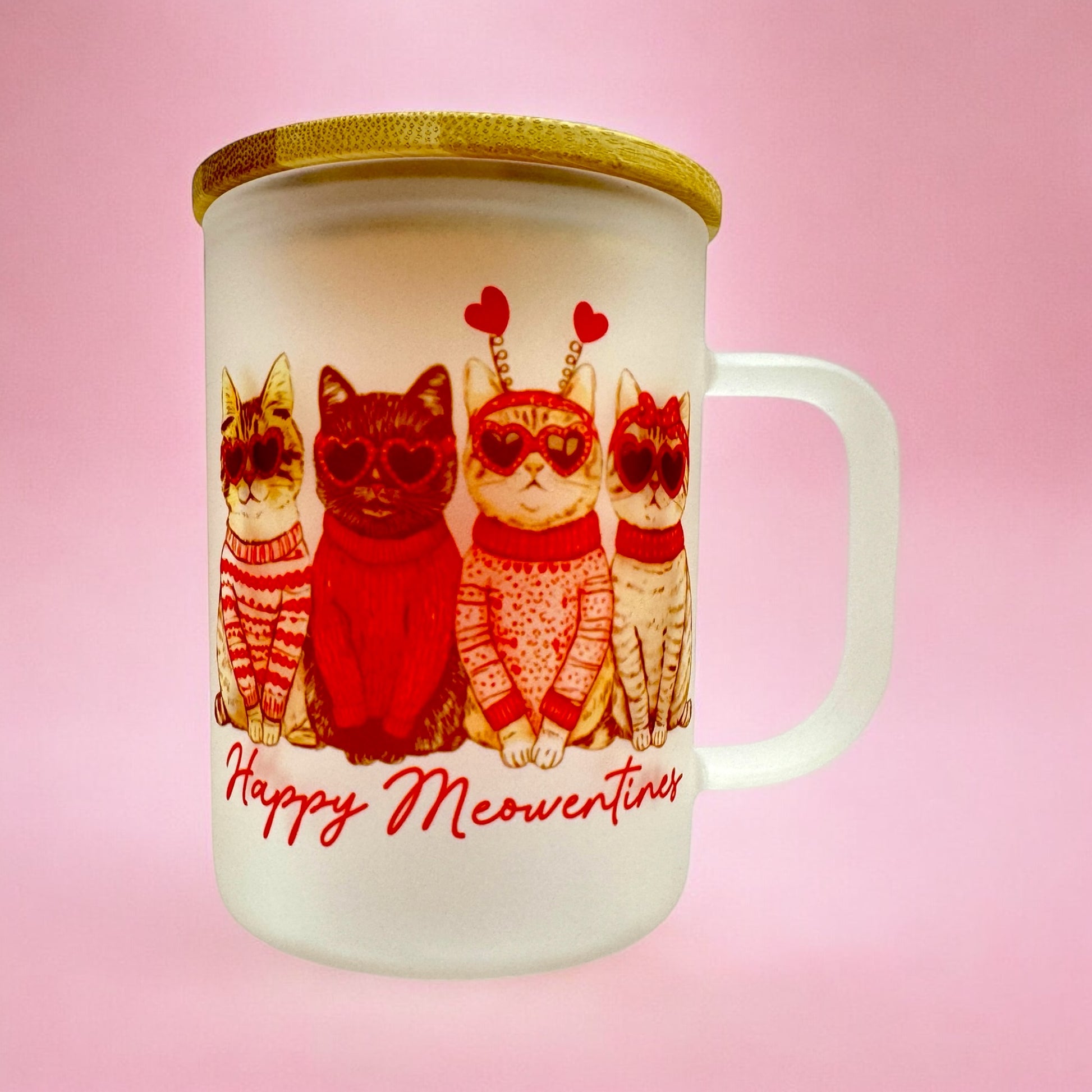 🐾 “Happy Meowentines” 16oz Frosted Glass Mug 🐱💖 with Bamboo Lid & Metal Straw
