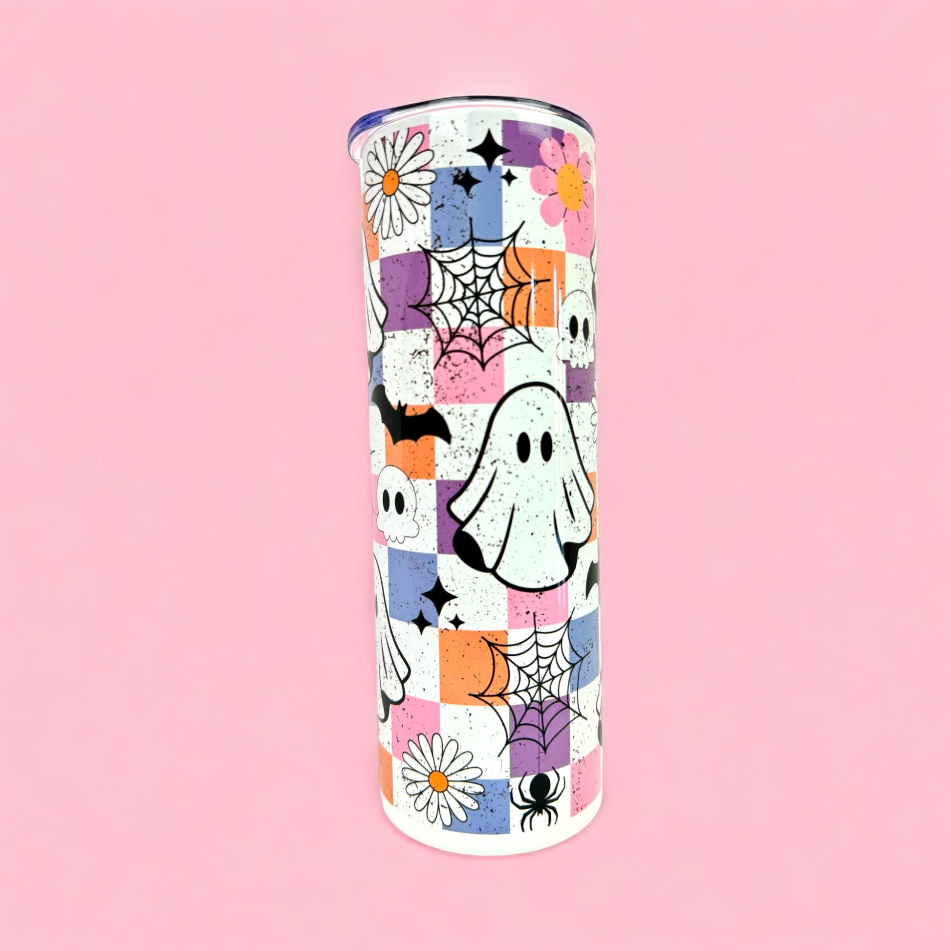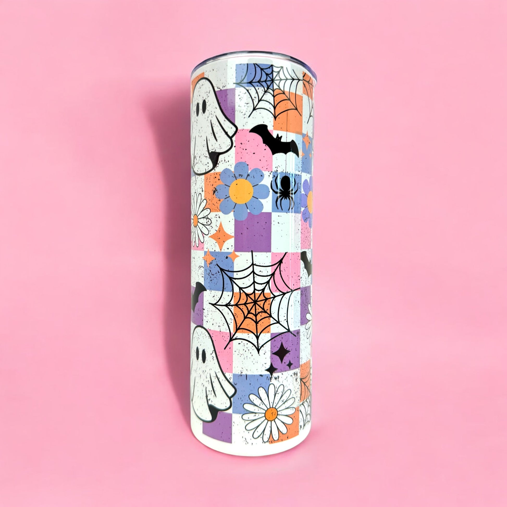 Bring some spooky-cute vibes to your drinkware collection with this 20oz tumbler. Featuring adorable ghosts, pastel flowers, spiderwebs, and bats, it’s the perfect mix of fun and festive for Halloween lovers. 🕷️🌼