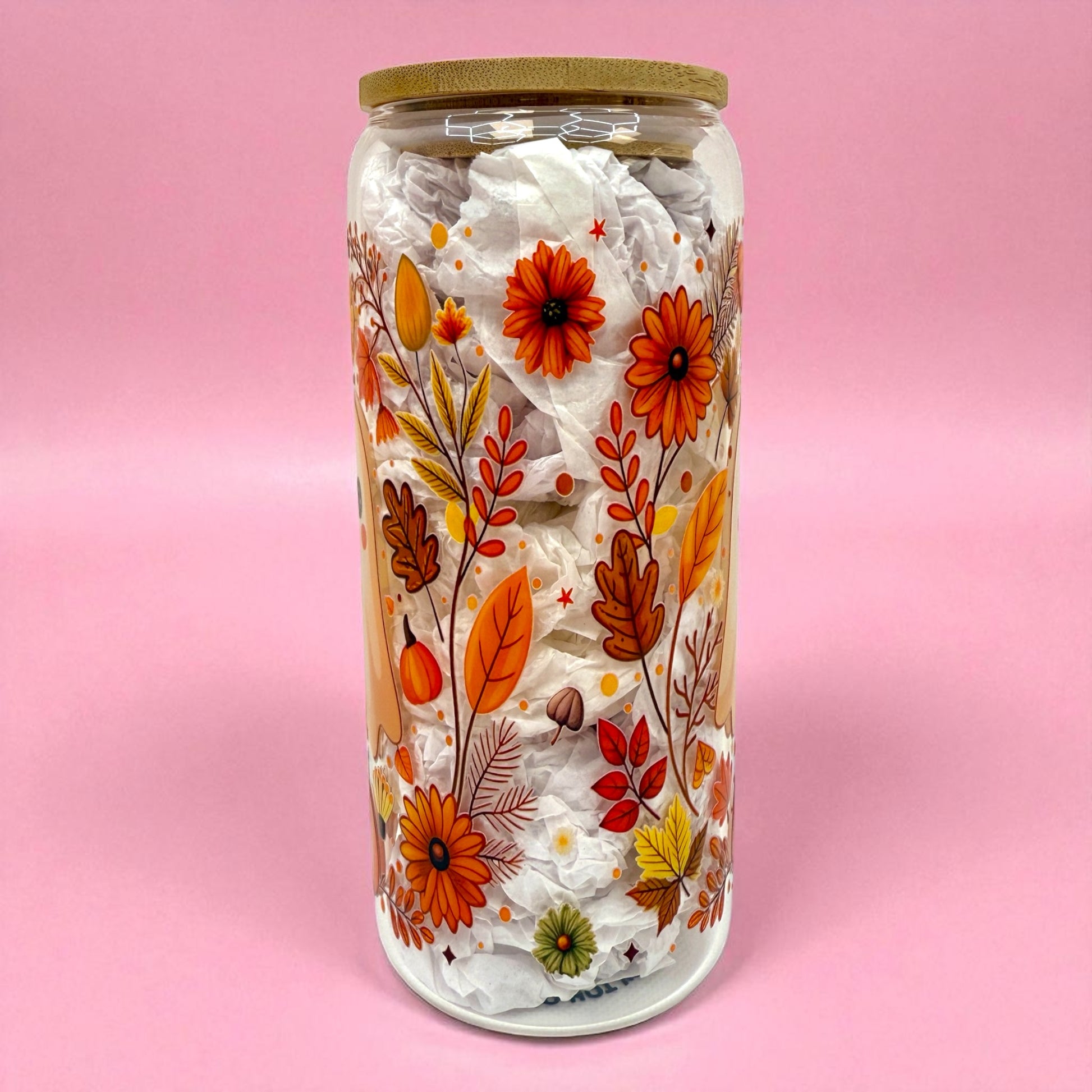 Fall just got cuter! This 20oz glass cup is decorated with a smiling ghost, pumpkins, and colorful autumn leaves. A playful mix of cozy vibes and festive Halloween spirit, perfect for your favorite fall beverages. 🍁✨