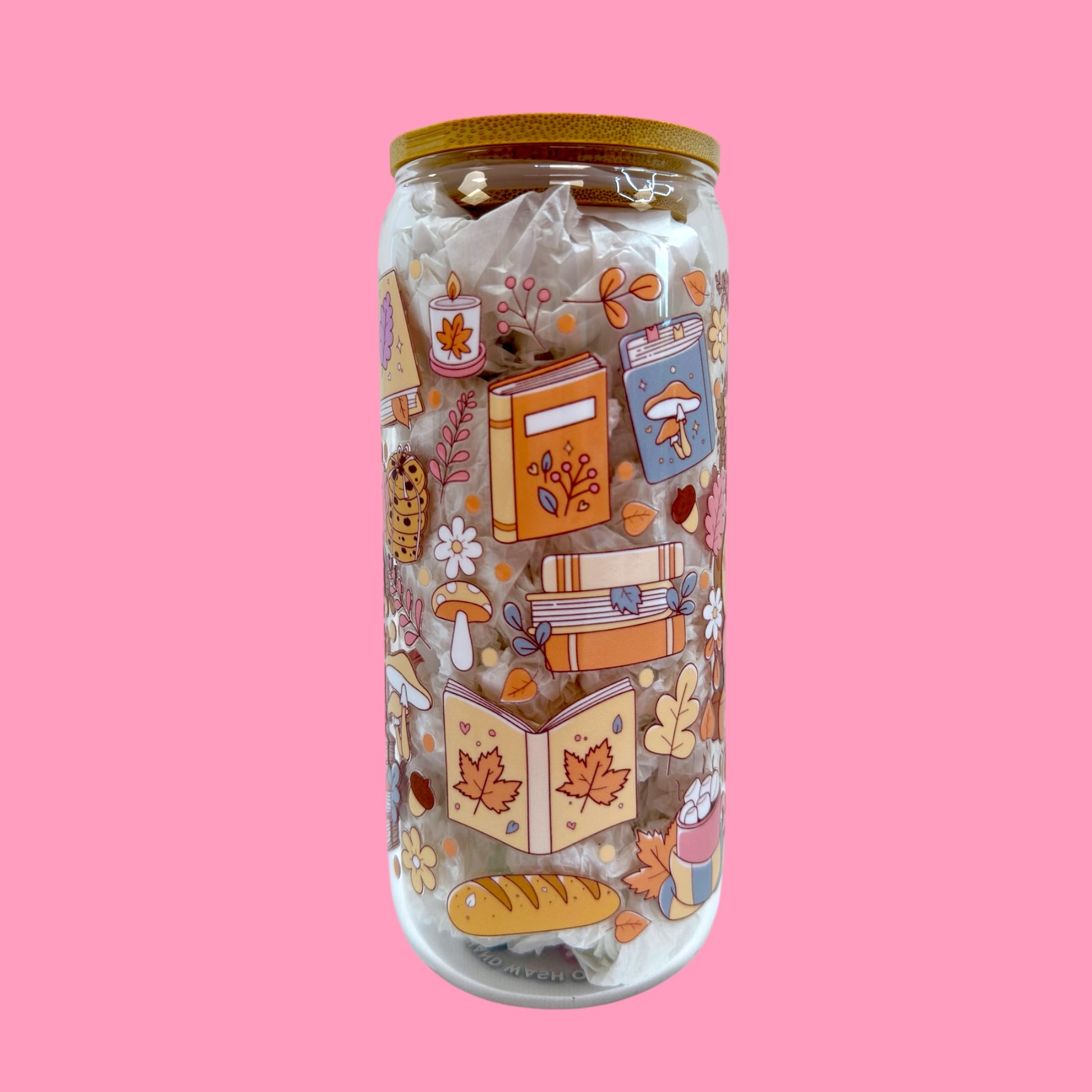 📚🍁 Cozy Reads & Fall Dreams – 20oz Glass Cup 🐱☕🍄