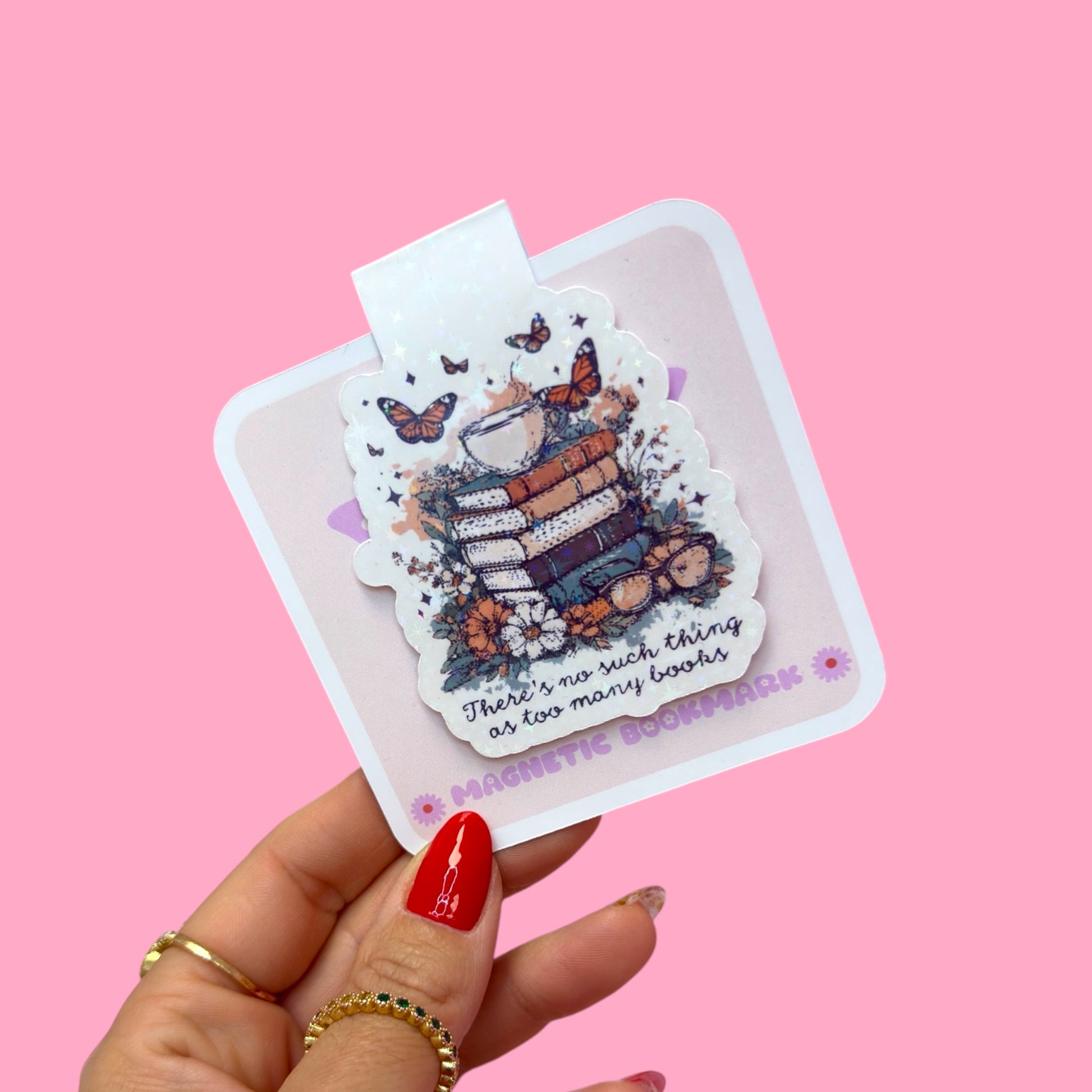 📚🦋 “Too Many Books?” – Cozy Stack Magnetic Bookmark