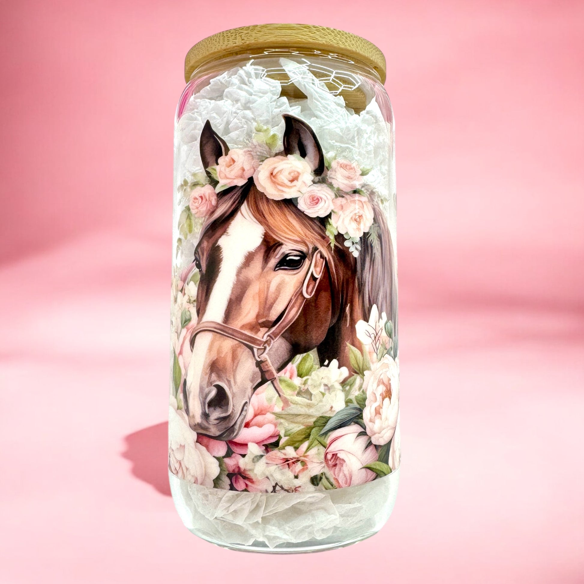 Blossom & Mane” 16oz Glass Cup with Bamboo Lid 🐴🌸🦋