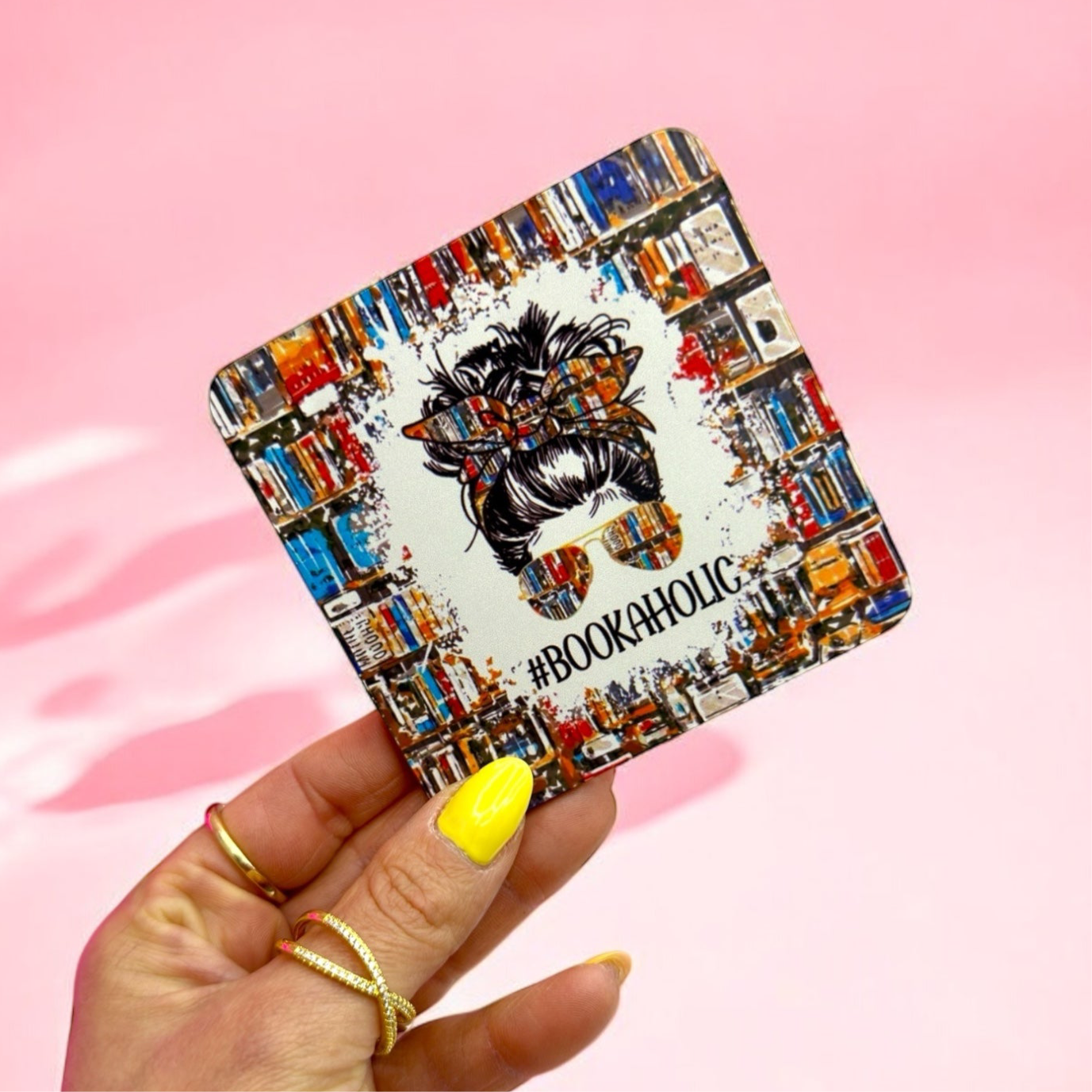 ”Bookaholic Messy Bun Coaster” 📚🖤🎀