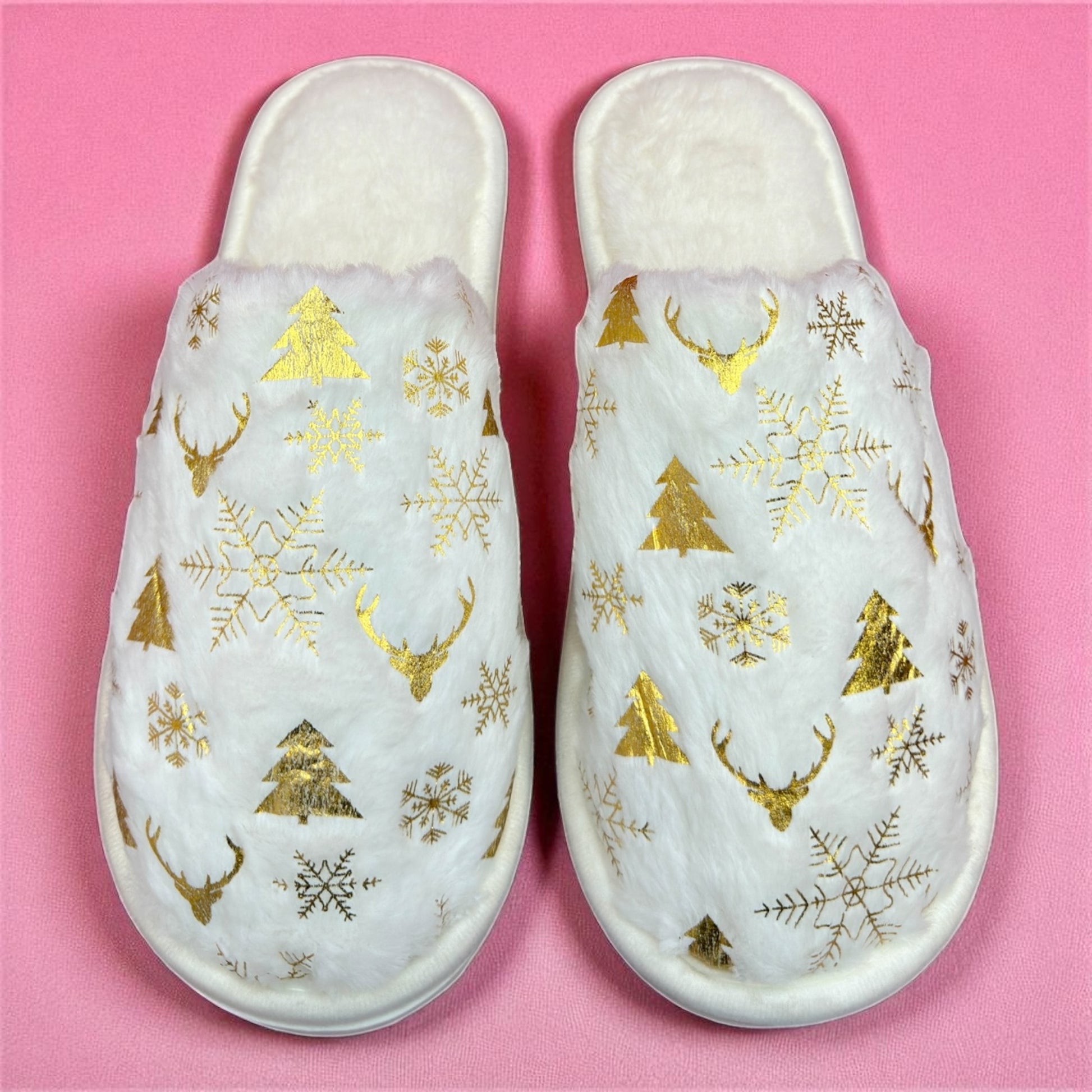 Add a touch of festive glam to your cozy moments with our Luxury Gold Christmas Slippers! Made from soft faux fur with a white base and elegant gold foil details featuring reindeer, snowflakes, and Christmas trees, these slippers bring sparkle and comfort together. Perfect for lounging at home, gifting, or creating that magical holiday morning vibe. ❄️☕🎁
