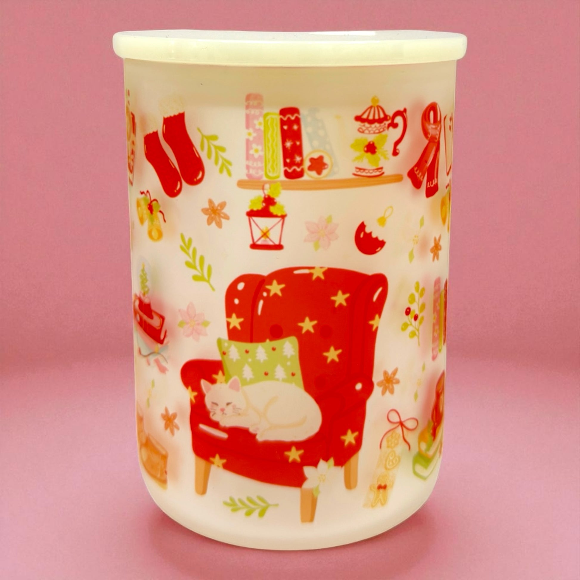 Wrap yourself in holiday comfort with our Cozy Christmas Corner 16oz Frosted Mug! This adorable mug features a festive reading nook design with books, stockings, Christmas wreaths, and a sweet cat napping on a red armchair. Perfect for sipping your favorite hot chocolate, coffee, or tea during the winter season. Its frosted glass finish gives it a soft, dreamy glow that feels extra cozy by the fire. 🎅📚🎁