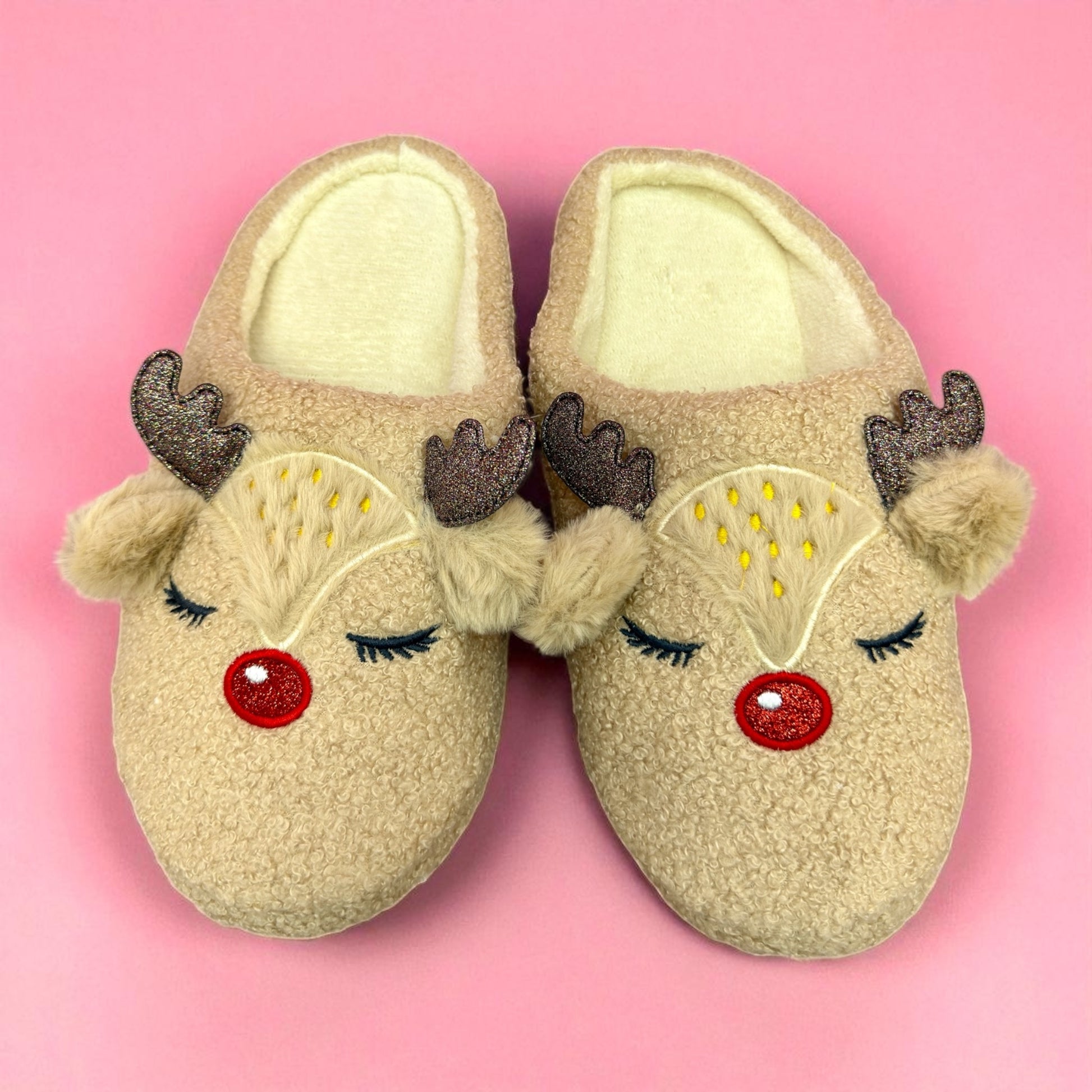 Keep your feet warm and festive with our Cozy Reindeer Christmas Slippers! Made from ultra-soft plush fabric, these adorable slippers feature a sleepy reindeer design with sparkly antlers, fluffy ears, and a shiny red nose. Perfect for lounging at home with a cup of hot cocoa and your favorite Christmas movie. ☕🎅💫