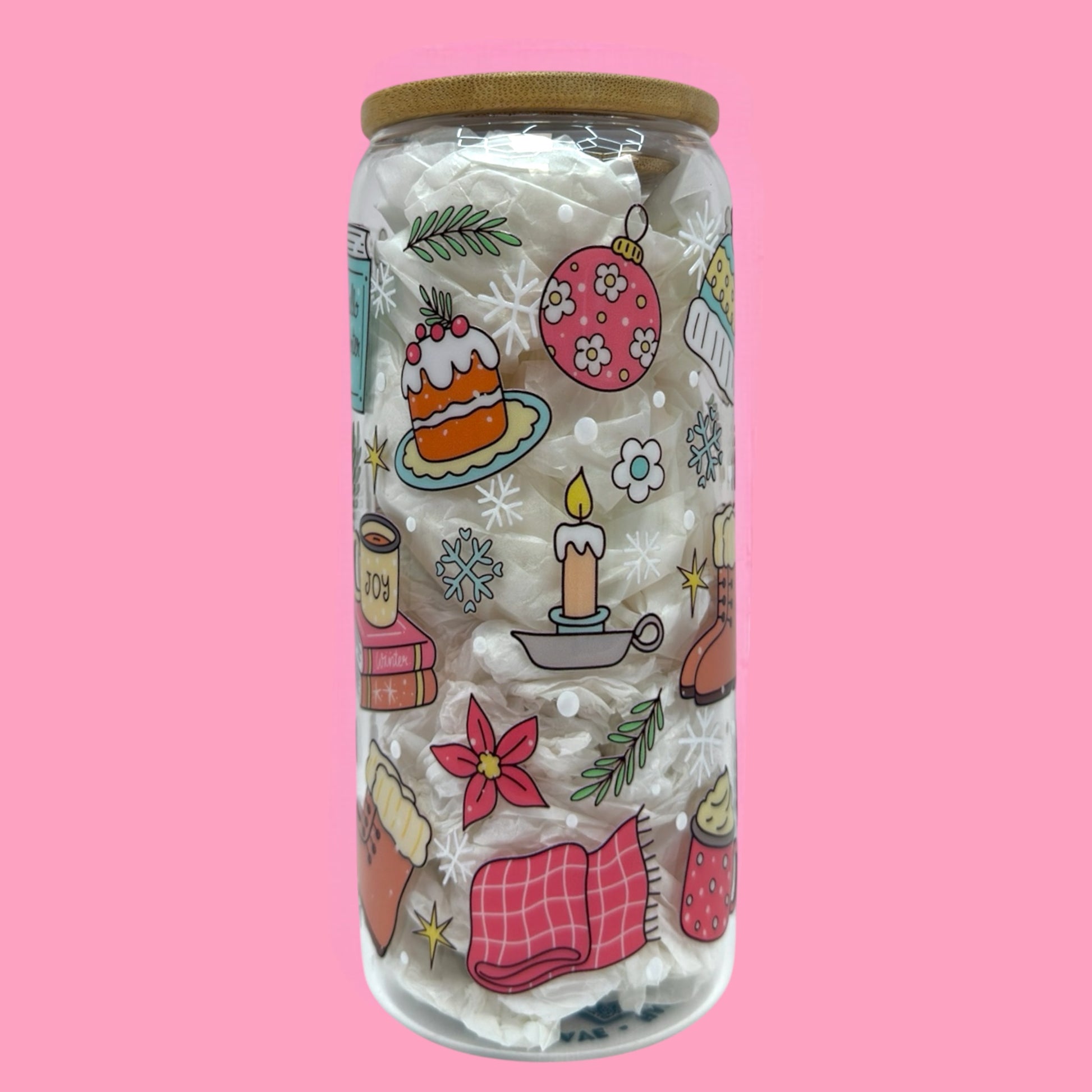 This 20oz glass cup brings a full cozy winter atmosphere to your drinks. It features a cute illustrated fireplace 🔥 stacks of books 📚 winter boots 🥾 candles 🕯️ sweet treats 🍰 snowflakes ❄️ and festive florals 🌺. Every detail creates a warm and comforting winter vibe, perfect for hot chocolate ☕ coffee or tea.